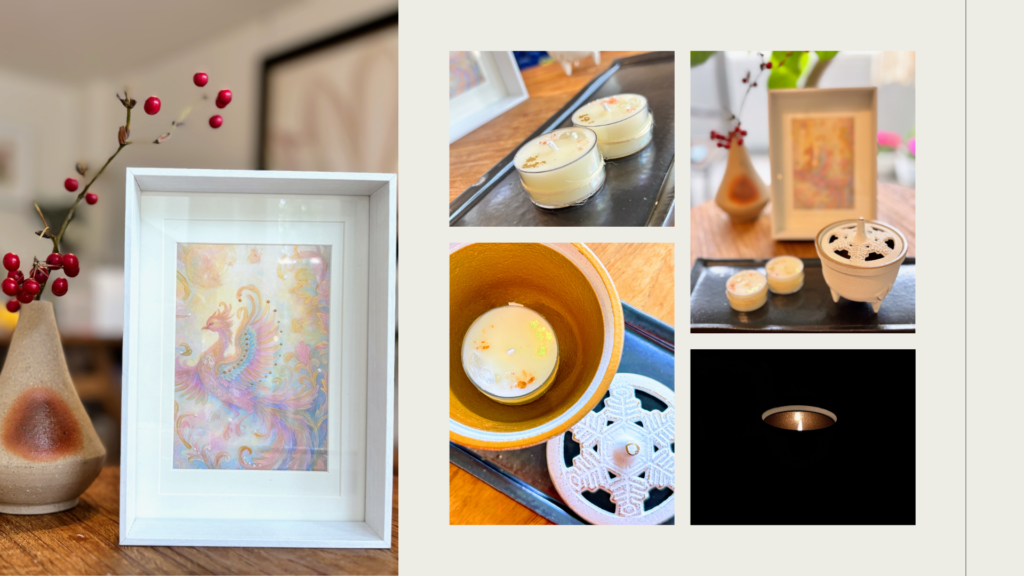 鳳凰のアート、岩鋳の香炉、精麻を結んだキャンドル。