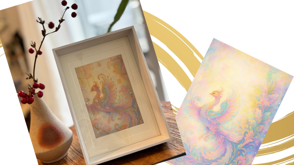 やわらかな光の中に舞う鳳凰は、再生と飛翔を象徴する存在です。